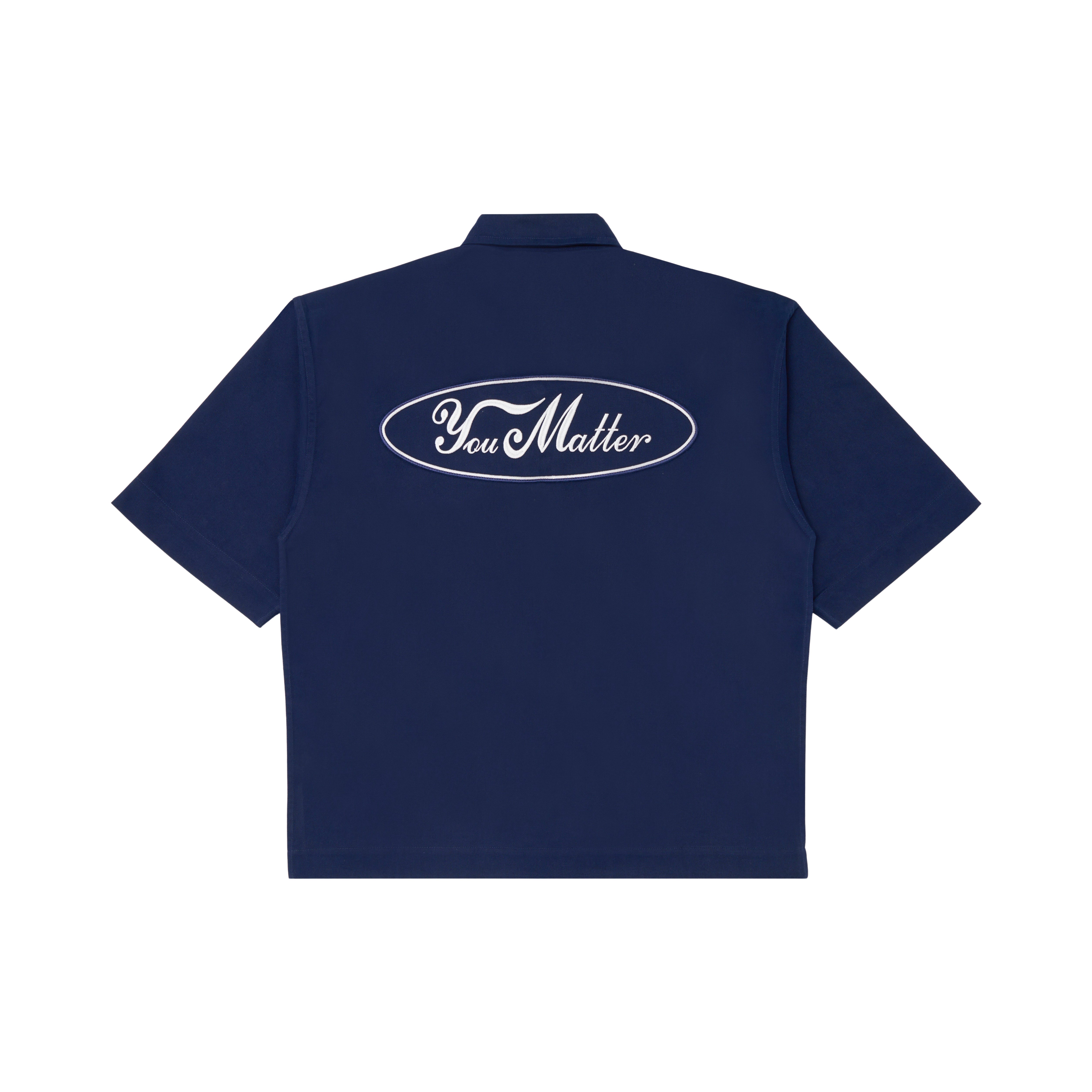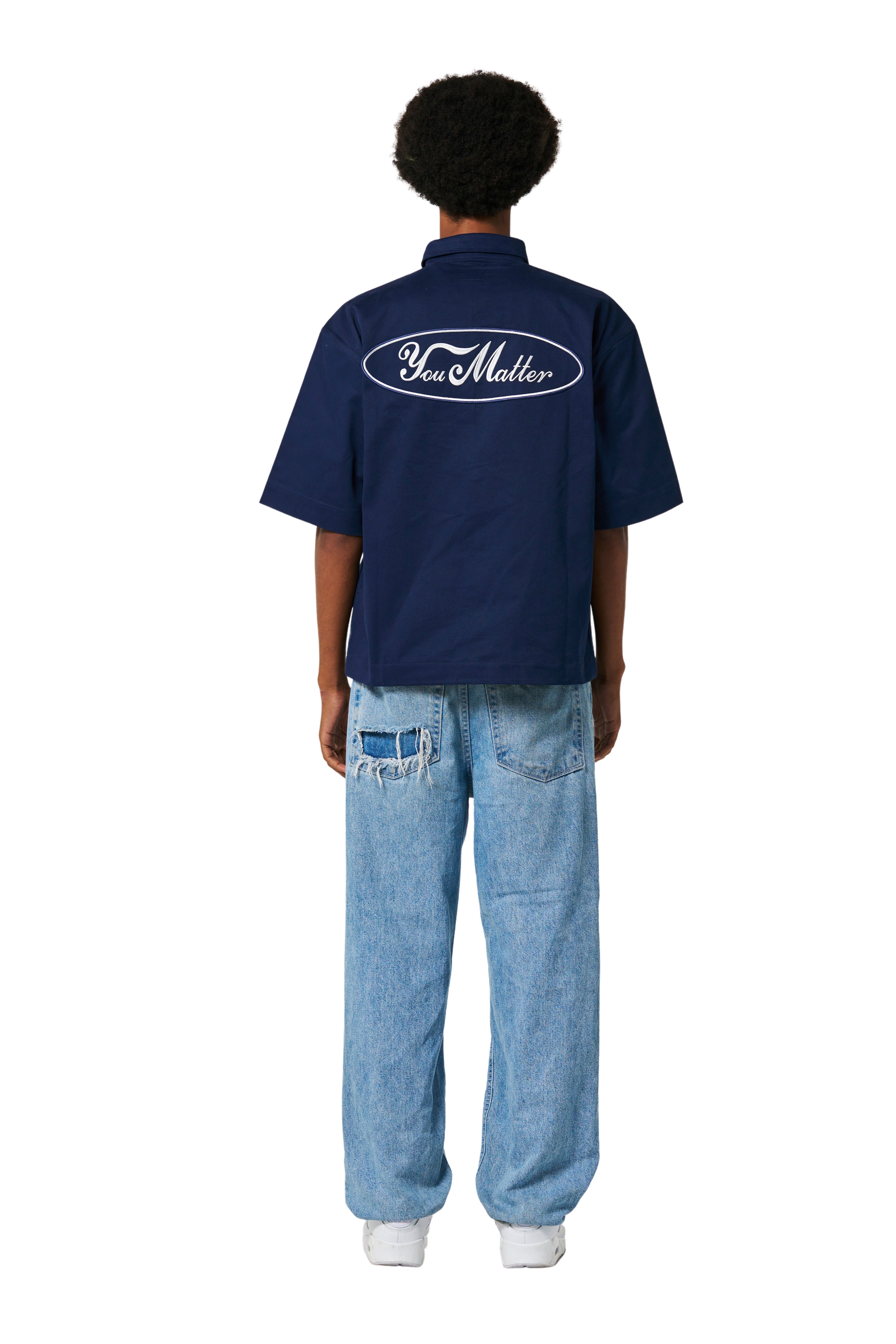 Featuring a classic collar, snap-button front closure, and a functional chest pocket, this shirt balances utility with intention. Finished with subtle You Matter branding on the front and a bold embroidered logo across the back, it’s a statement piece rooted in purpose and confidence.